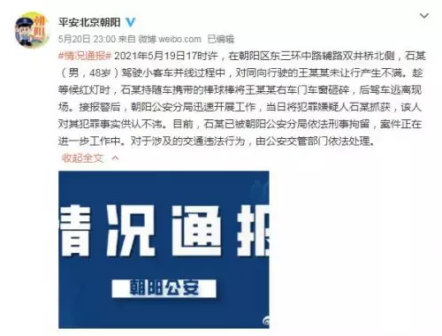 北京市公安局朝陽分局官方微博20日晚通報指,5月19日17時許,在北京市朝陽區東三環中路輔路雙井橋北側,石某(男,48歲)駕駛小客車併線過程中,對同向行駛的王某某未讓行產生不滿。趁等候紅燈時,石某持隨車攜帶的棒球棒將王某某右車門車窗砸碎,後駕車逃離現場。
