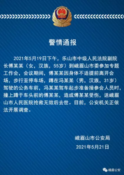2020年5月19日下午,樂山市中級人民法院副院長傅某某(女.漢族,55歲)到峨眉山市委參加專題工作會,會議期間,傅某某因身體不適提前離開會場,步行至停車場,蹲在馮某某(男,漢族,31 歲)駕駛的公務車前。馮某某駕車起步準備接參會人員時,撞上蹲於車頭前的傅某某,造成傅某某受傷,送峨眉山市人民醫院搶救無效後去世。目前,公安機關正依法開展調查。