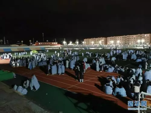5月22日凌晨,在青海省果洛藏族自治州州府瑪沁縣,果洛州民族高級中學的學生在操場避險。新華社發