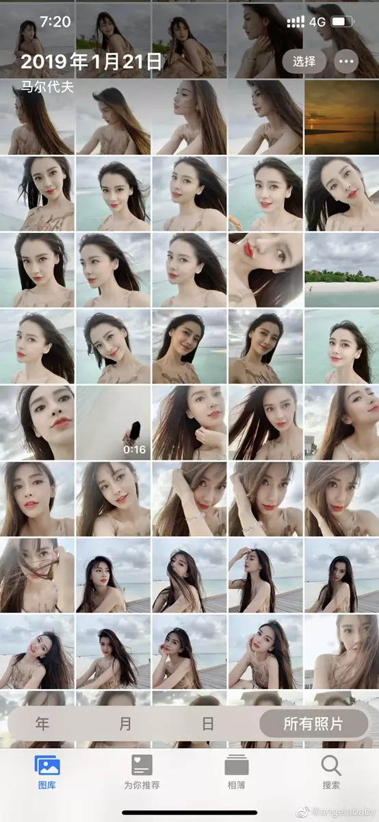 21日Angelababy首先在微博上傳了一張手機相簿的截圖並寫下:「我也有滿屏自拍的時候(521福利)」,可見照片是19年1月她在馬爾代夫度假的時候拍攝,她身穿吊帶裙在海灘自拍,美貌依然。但由於手機截圖並未滿足到粉絲,網民都叫Angelababy上傳原圖,而她亦相當識做,在留言區上傳了6張自拍照。