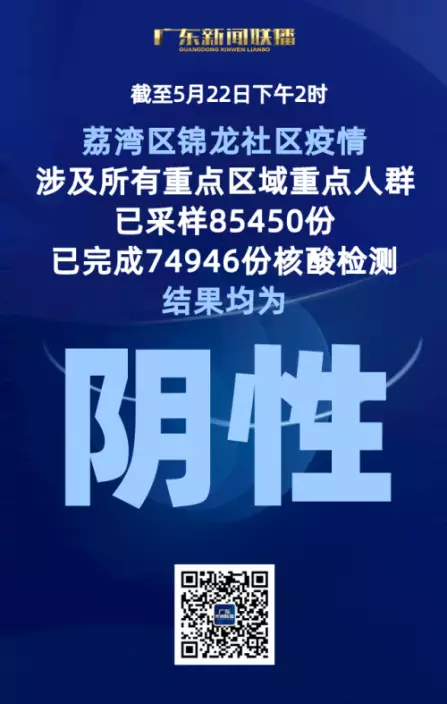 截至5月22日下午2時,荔灣區錦龍社區疫情涉及所有重點區域重點人群已採樣85450份,已完成74946份核酸檢測,結果均為陰性。