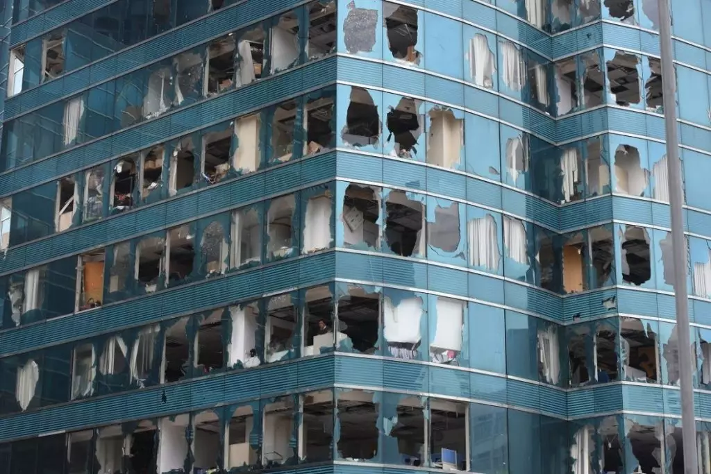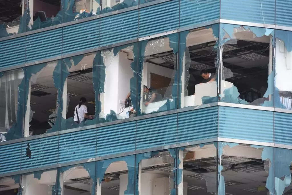 超強颱風山竹吹襲,紅磡海濱廣場寫字樓受嚴重破壞,逾百個玻璃窗幕牆破碎。資料圖片