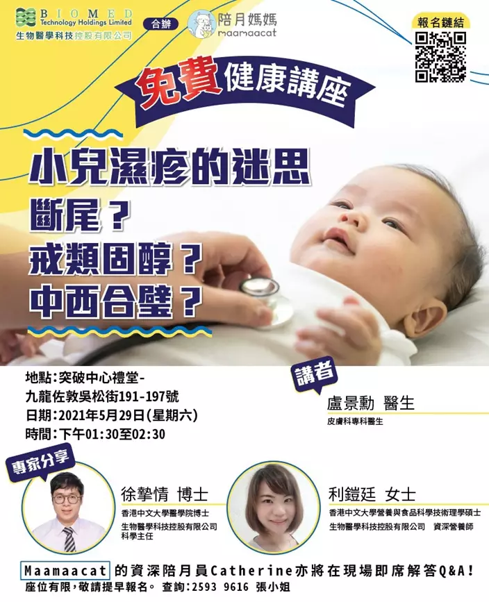 另外,29/5 今個星期六,將有一場免費專題講座,請來皮膚科醫生、營養學家等專家探討小兒濕敏的迷思,包括能否斷尾、戒類固醇的方法、中西合壁是否有效等。