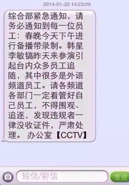 李敏鎬一落機,冇咩休息就現身央視春晚彩排現場,當然吸引不少人圍觀,由於央視員工都喪追李敏鎬,社交網傳短訊疑為央視內部通知,要求各部門管好員工,仲話違規者會嚴肅處理,可想而知李敏鎬人氣幾旺。