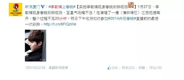 請務必通知到每一位員工:春晚今天下午進行備播帶錄製。韓星李敏鎬昨天來參演引起台內眾多員工追逐,發現違規者一律沒收證件,嚴肅處理。(圖片來源:新浪微博)