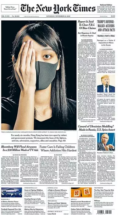 二〇一九年八月十一日反修例示威中受傷的「爆眼少女」,不但成為本地傳媒的頭條新聞,三個月後更登上《紐約時報》頭版。《紐約時報》在同年十一月於頭版登出「爆眼少女」的照片,佔去近半版面,相中女子以右手蓋着右眼,並以「被擊中眼球的義務急救員」(Volunteer Medic Struck in the Eye)形容她。