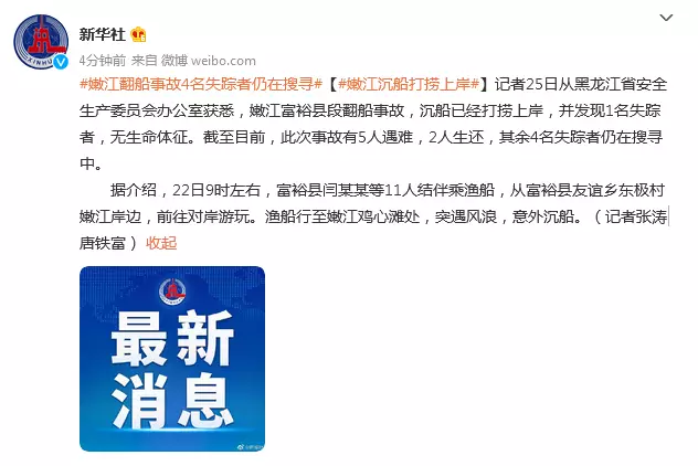 【嫩江沉船打撈上岸】記者25日從黑龍江省安全生產委員會辦公室獲悉,嫩江富裕縣段翻船事故,沉船已經打撈上岸,並發現1名失蹤者,無生命體征。截至目前,此次事故有5人遇難,2人生還,其餘4名失蹤者仍在搜尋中。