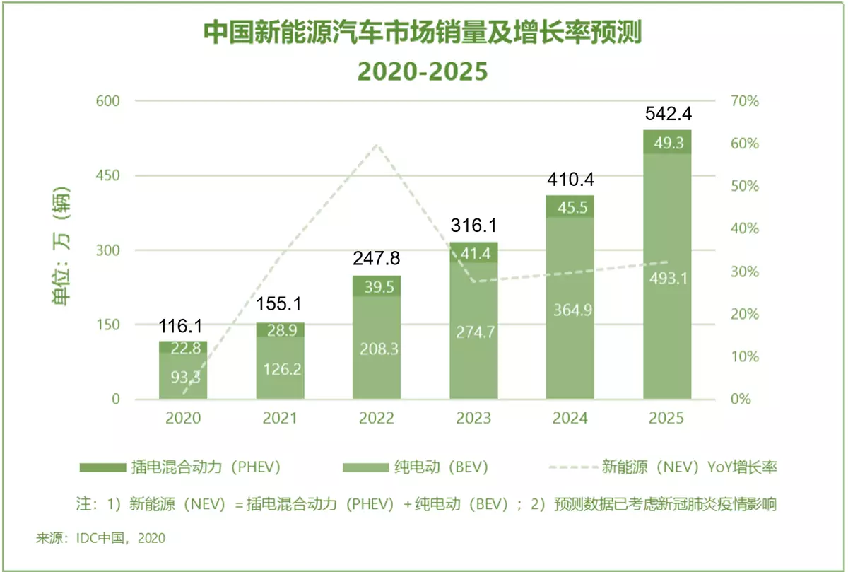 巿場預期届時新能源車的銷量將達到600萬輛左右,預期新能源汽車在未來5年年均增長可超過40%。IDC早前預計,中國新能源汽車市場未來5年將會强勁增長,2021至2022年受惠於疫情後的車市反彈和財政補貼期限的延長,新能源汽車銷量將實現大幅增長;而到2025年新能源汽車銷量將達到約542萬輛,年均複合增長率(CAGR)將達36.1%。産品結構方面,純電動汽車在新能源汽車市場占據的份額將由2020年的80.3%提升至2025年的90.9%。