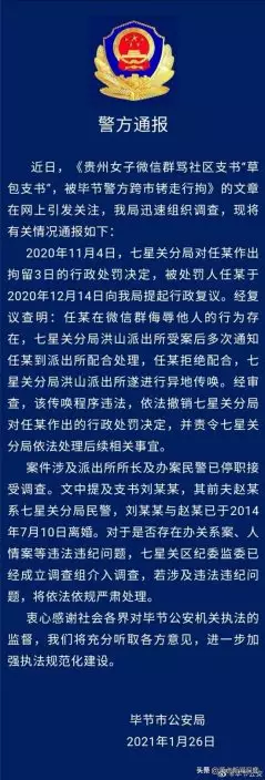 2021年1月26日晚上11:03,畢節警方深夜緊急發佈「警方通報」稱,近日,《貴州女子微信群罵社區支書“草包支書”,被畢節警方跨市銬走行拘》的文章在網上引發關注。