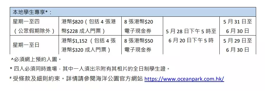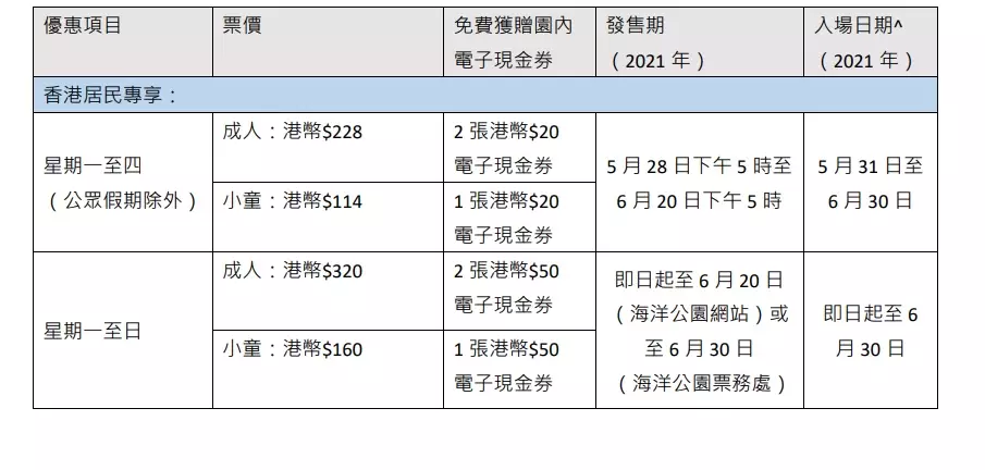 而適用於任何日子入埸的港人限定門票優惠,6月20日前於海洋公園網站有售,海洋公園票務處將發售此優惠門票至6月30日。