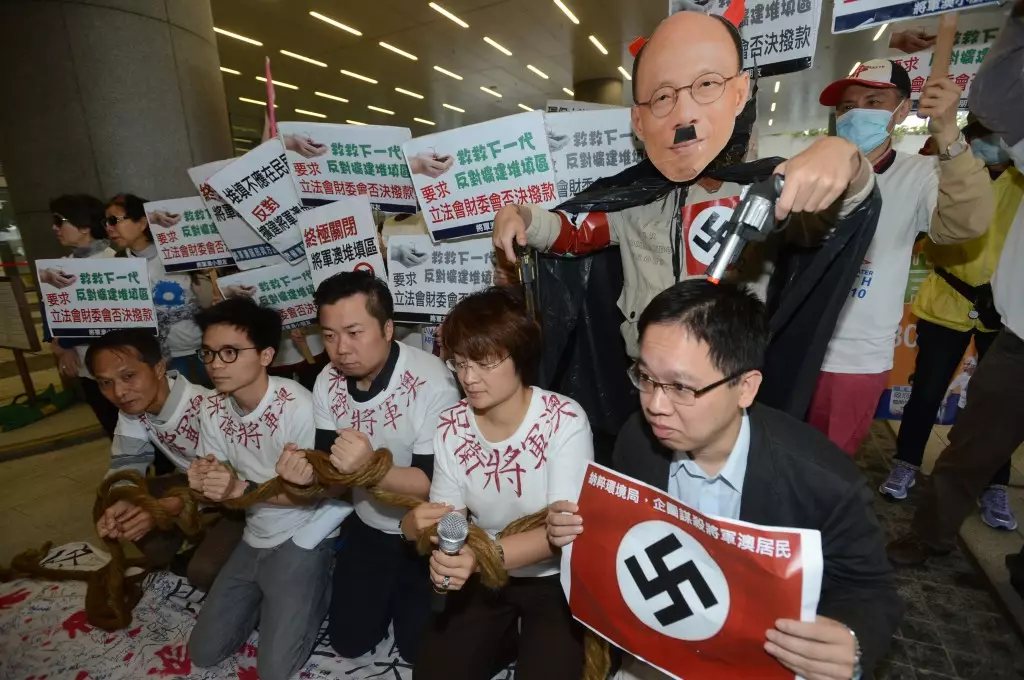 西貢區區議員方國珊(48歲)及兩名議員助理張美雄(26歲)和方裕政(30歲)在去年5月7日及13日立法會審議「一堆一爐」時,聯同十多名將軍澳居民 在公眾席上,展示印有納粹標誌並寫上「毒氣集中營堆填區」的紙條及大叫「無恥」,令會議一度中斷。