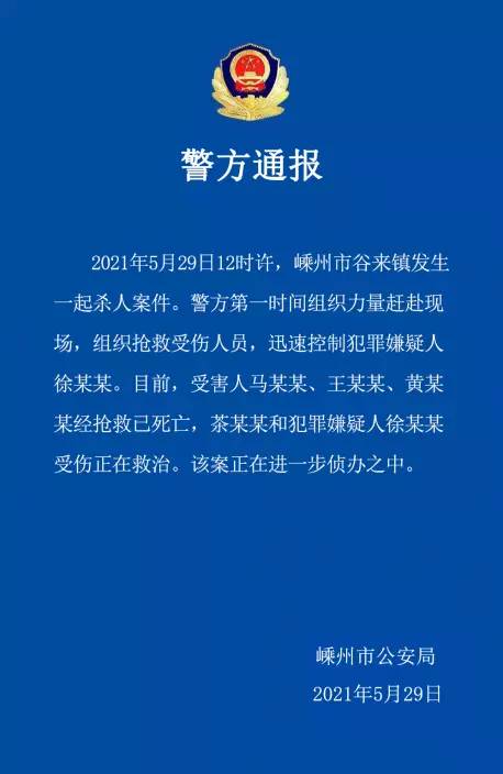 2021年5月29日12時許,嵊州市谷來鎮發生一起殺人案件。警方第一時間組織力量趕赴現場,組織搶救受傷人員,迅速控制犯罪嫌疑人徐某某。目前,受害人馬某某、王某某、黃某某經搶救已死亡,茶某某和犯罪嫌疑人徐某某受傷正在救治。該案正在進一步偵辦之中。