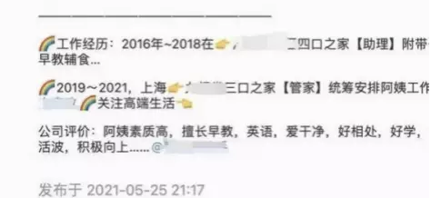 筆者注意到,這名清華女生以往的工作中,有高檔小區的家庭助理、管家等經歷。可見,該女生的當保姆意願,並非一時衝動,更可能她在此前的經歷中,發覺了自己在這方面的興趣、特長,願意繼續從事這一行。公司對其的評價也是,阿姨素質高,擅長早教、英語,好相處……性格開朗……