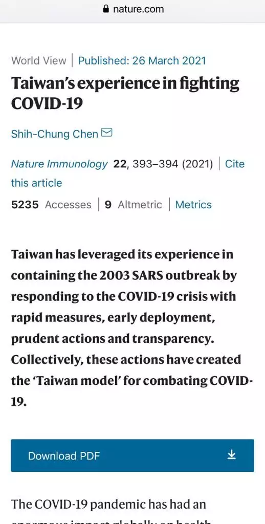 陳時中3月底曾在綜合自然科學類期刊《科學報告》 發表文章,推銷「台灣模式」抗疫。