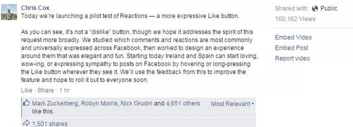 fb首席產品主管考克斯(Chris Cox)在自己帳號發影片介紹新功能,只要長按「Like」就會出現不同表情符號,喜怒哀樂樣樣有,唯獨沒有「Dislike」。