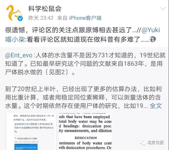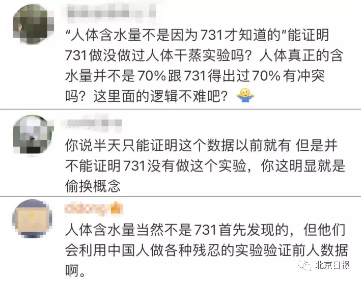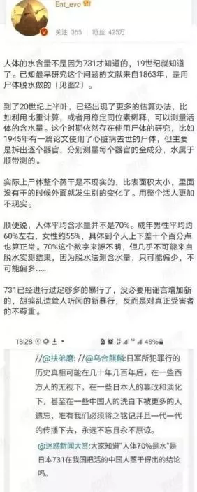 當天,一名擁有425萬微博粉絲的科普大V、科學松鼠會成員@Ent_evo 發文,一本正經地「闢謠」稱“把活人蒸干測量含水量不現實”,聲稱“沒必要用謠言為731部隊增加新的暴行”。