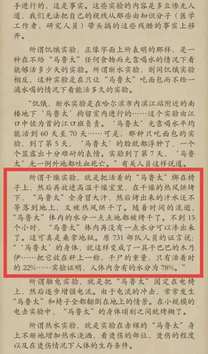 書中寫道,原731部隊人員的證言說:「‘馬魯太’的身體,就這樣變成了一具乾巴巴的木乃伊……把它放在秤上一稱,乾屍的重量,只有活著時的22%……實驗證明,人體內含有的水分為78%。」