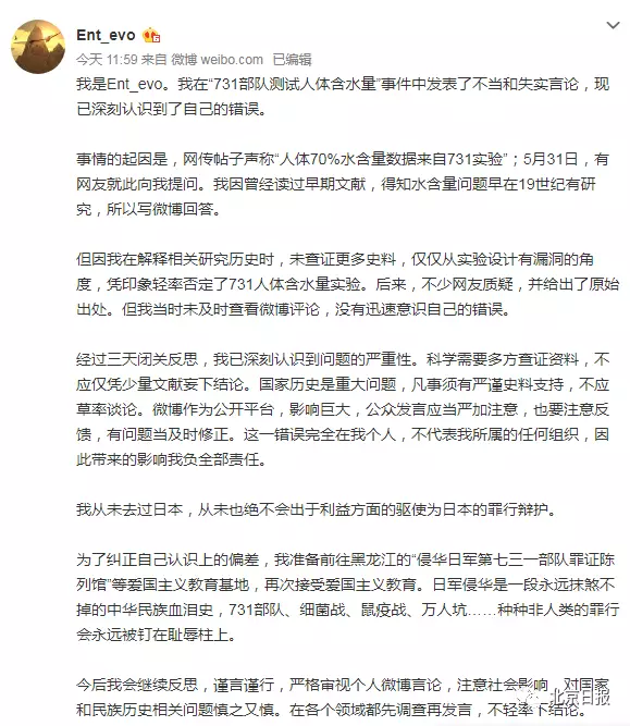 在鐵證面前,今天,@Ent_evo 發文致歉,稱自己在「731部隊測試人體含水量」事件中,發表了不當和失實言論,現已深刻認識到了自己的錯誤。