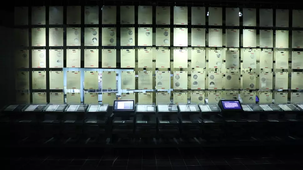 侵華日軍第七三一部隊罪證陳列館人體實驗展區,一張張英文人體實驗報告書複印件,連成一面牆。新華社記者 何山 攝
