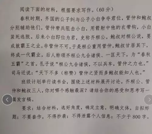 齊桓公、管仲 、鮑叔三個人物。春秋戰國時期,管仲用兵阻擊小白…… 請考生挑出其中一個人物,寫出自己的感受。