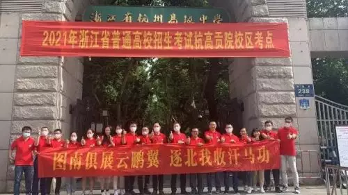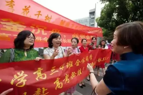 今天一早,各考點門口,家長老師們已經齊齊穿著紅衣,給同學加油鼓勁。同往年一樣,旗袍橫幅依然是送考隊伍中的標配。