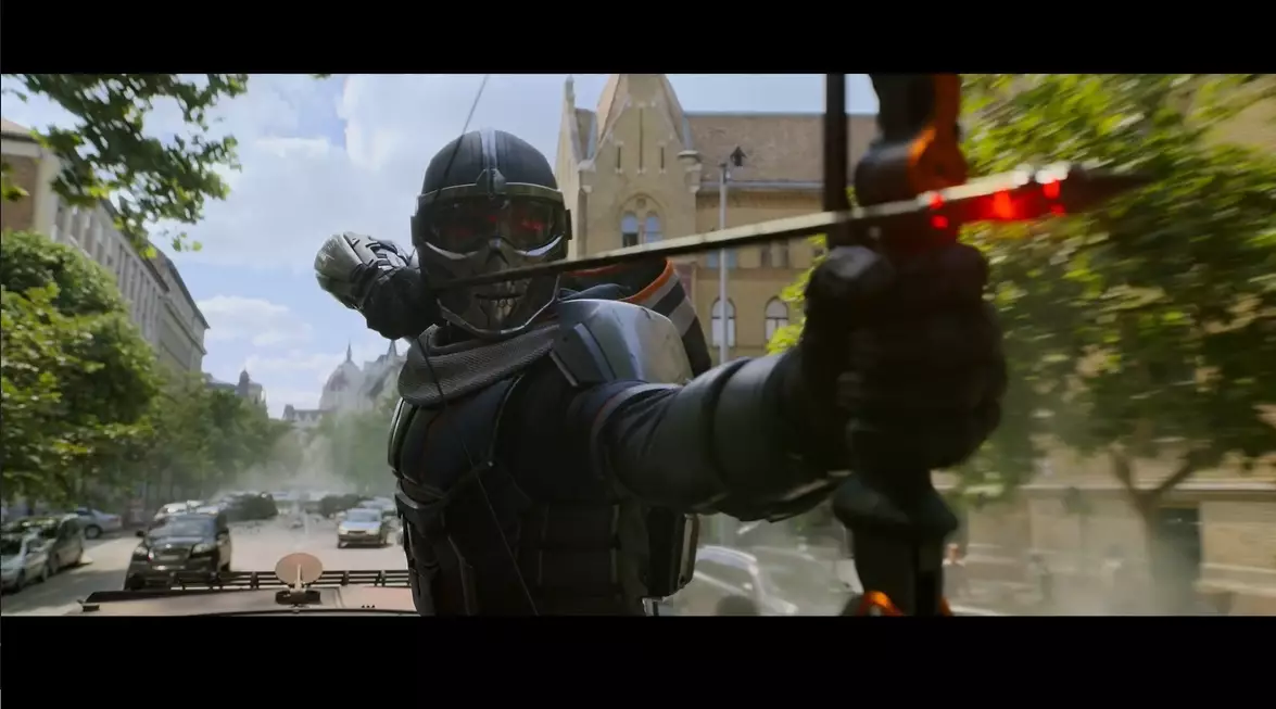 反派模彷大師盜取鷹眼的能力,向黑寡婦和「第二代黑寡婦」座駕射出弓箭。
