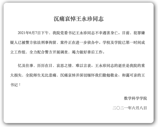 公告稱,6月7日下午,王永珍不幸遇害身亡。目前,犯罪嫌疑人已被警方依法刑事拘留,案件正在進一步偵辦中。復旦大學及數學科學學院已第一時間成立工作組,全力配合警方開展調查,竭力做好善後工作。