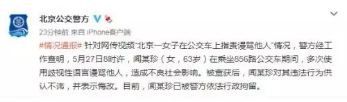 針對網上一視頻「北京一女子在公交車上指責謾罵他人」情況,警方經工作查明,5月27日8時許,聞某珍(女,63歲)在乘坐856路公交車期間,多次使用歧視性語言謾罵他人,造成不良社會影響。被查獲後,聞某珍對其違法行為供認不諱,並表示悔改。目前,聞某珍已被警方依法行政拘留。