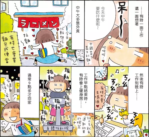 繪本其中一個故事,是直接刻劃很多打工仔經歷:一邊工作一邊想著中午及晚上打算吃甚麼,超有計劃及憧憬的,但一OT返家就過了晚飯時間,結果太餓太累,就隨便煮個麵或翻熱雪櫃的剩餸菜......