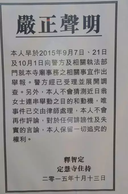 釋智定張貼聲明表示,已向警方及相關執法部門就寺廟事務之相關事宜作出舉報,警方已受理並展開調查。聲明又指,不會猜測近日翁女士連串舉動之目的和動機,對於任何誹謗性及失實的言論,保留一切追究的權利。