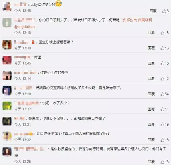 中國醫學科學院整形外科醫院長祁佐良今早在北京為Angelababy楊穎進行臉部鑑定,短短兩小時就證實Baby無後期加工,大批網民在他微博留言大罵庸醫,質疑他收錢。