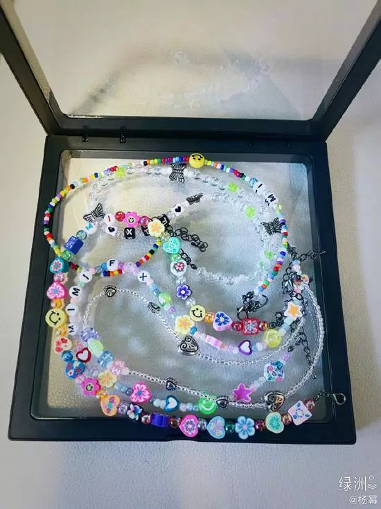 6月18日,楊冪綠洲曬出閨蜜DIY的項鏈,並發文表示“貓姐給我做的,全世界獨一份的。”項鏈中還有“MIMI”和“FOX”的元素,不單顏色鮮豔奪目,而且還排滿了得意可愛的花花和表情圖案,充滿少女味,細節超有心思。