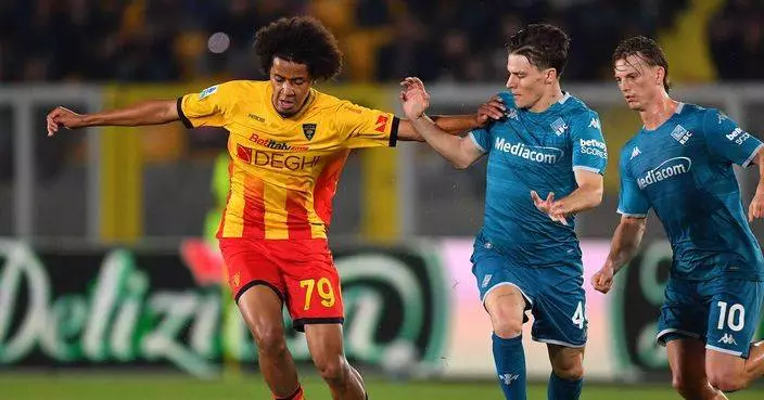 2026年4月20日周一,意大利萊切,萊切球員奧馬艾高姆(Oumar Ngom,左)與費倫天拿球員尼高路法基奧利(Nicolò Fagioli,中)在意大利意甲足球賽事中,與費倫天拿對陣。(美聯社圖片/Giovanni Evangelista/LaPresse) AP圖片