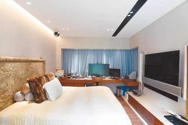 單位原為3房1套,現改為2房1套間隔,主臥同樣設有轉角窗及對流窗,引景入室,而且面積偌大,擺放雙人大牀後仍可三邊下牀,裝潢格調與大廳同出一轍,並連衣帽間。另一房間現時用作打坐房,一旁備有茶色玻璃大櫃,物件收納井井有條。