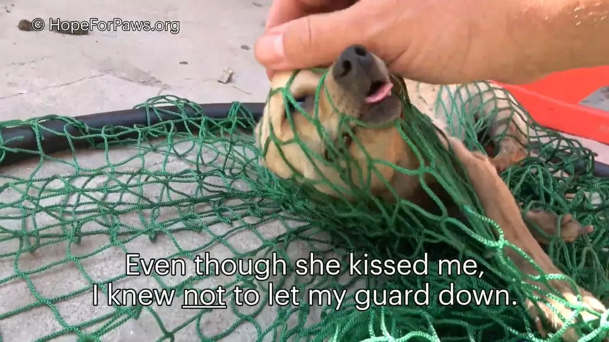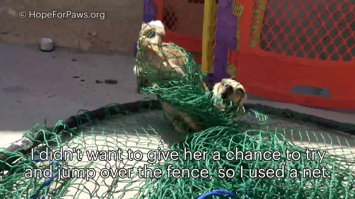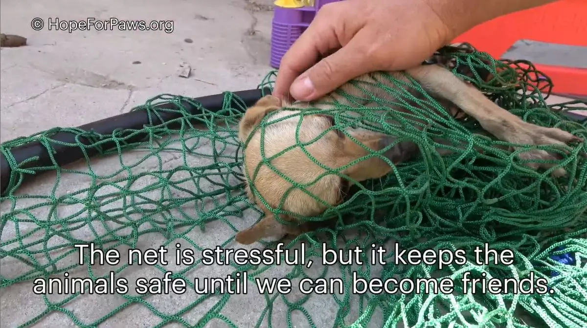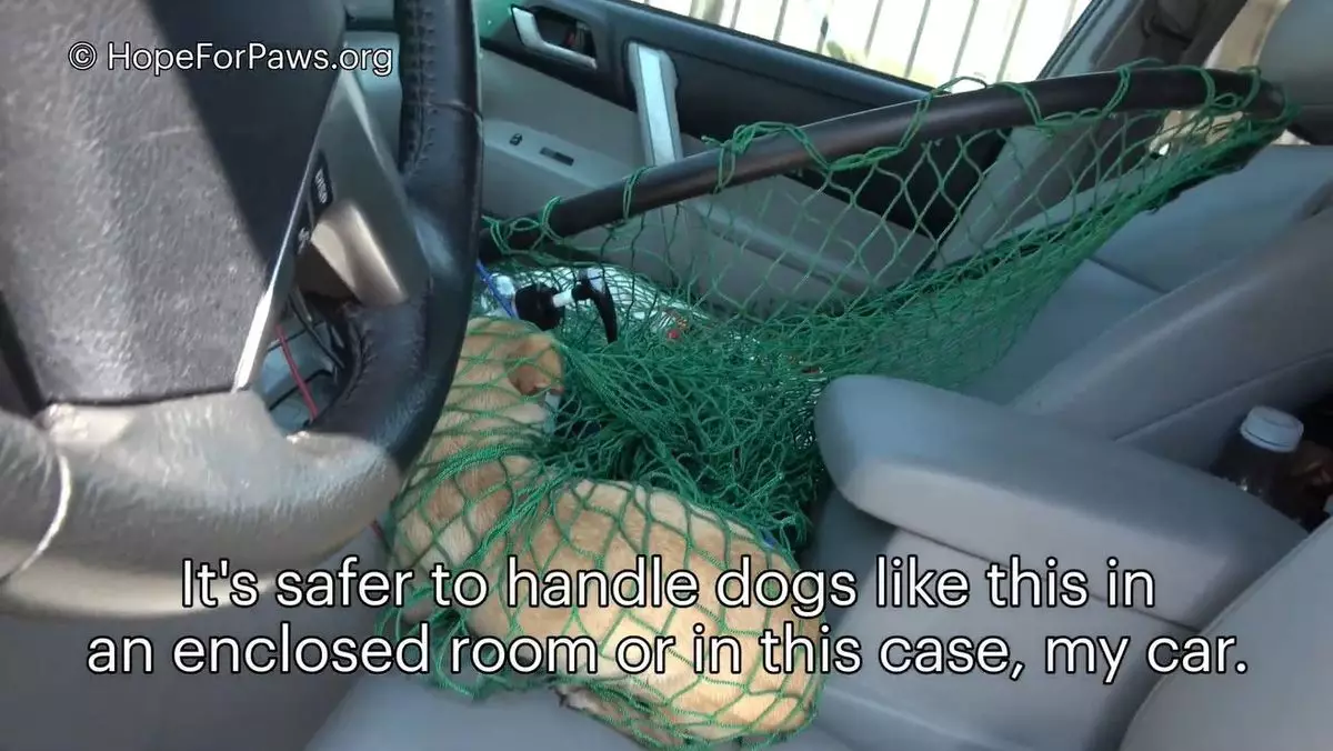 為了讓狗狗冷靜,救援人員用網將牠套住,然後摸摸牠,安撫牠。狗狗感受到求援人員的善意,很快就冷靜下來,並舔一舔援人員的手。其後,求援人員將狗狗連網帶狗帶上去,然後在車上解開網,狗狗馬上到一旁的毛氈上安心趴下。