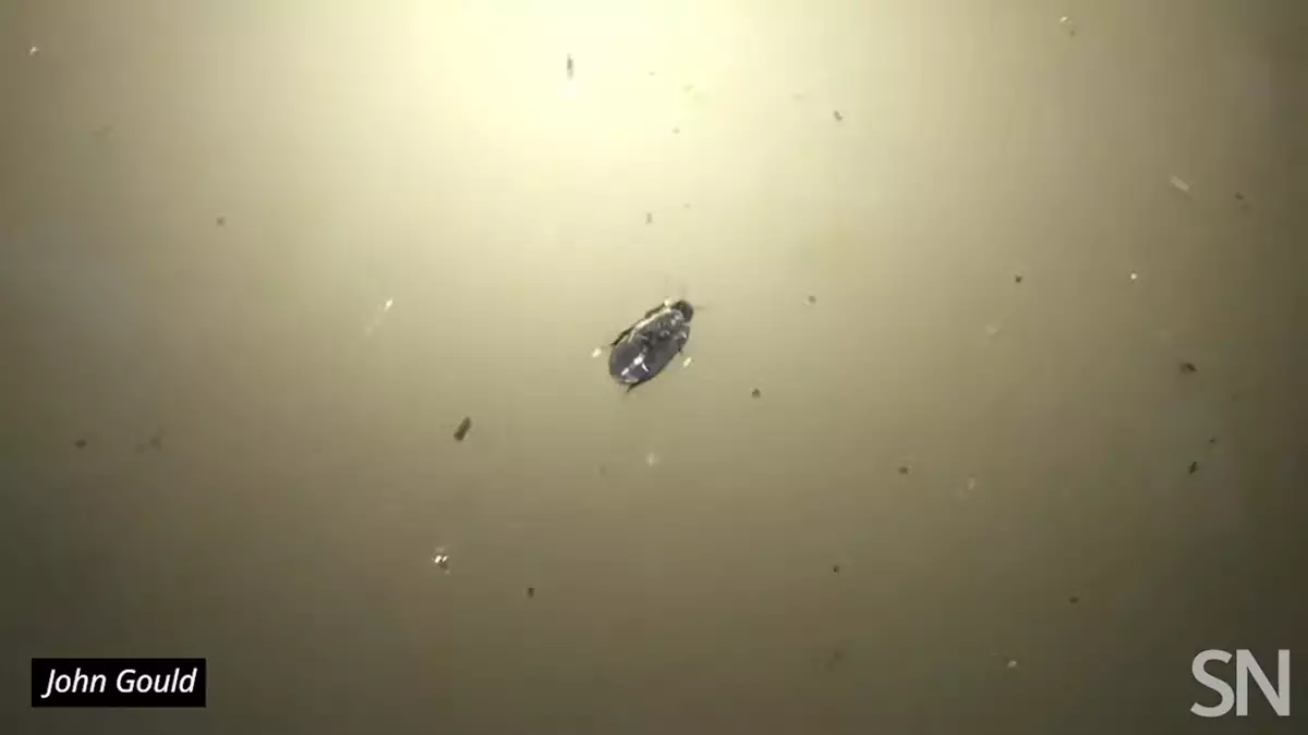 無意間發現這種奇特甲蟲的澳洲紐卡索大學生物行為學者John Gould表示,當時一見到這隻甲蟲時還以為是一隻掉入水中正在掙扎的蟲子,仔細一看才發現「這隻蟲子是在水面下奔跑」。他連忙將神奇的場景錄製下來,從他拍攝的影片可見到,甲蟲水面下倒著行走暢通無阻,水面下方仿佛是個堅固的平面,牠不斷改變方向四處遊走也會駐足休息。