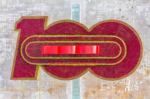 五星花、千日紅、紅穗冠等植物以正紅色為主色調營造整體造型為「100」的花卉景觀,並以鮮艷的五星花、鳥尾花等給「100」鑲上金邊,表達對黨的美好祝福。