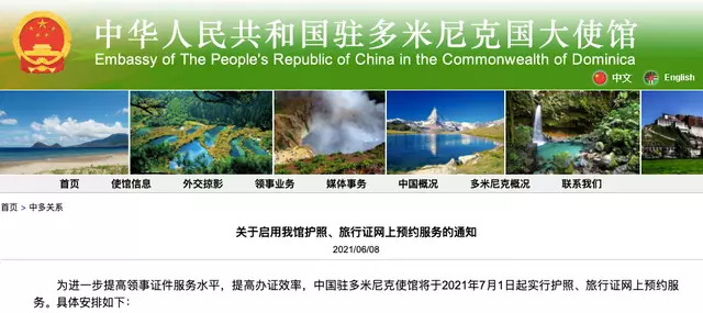 ◆中國駐多米尼克使館啟用護照、旅行證網上預約服務