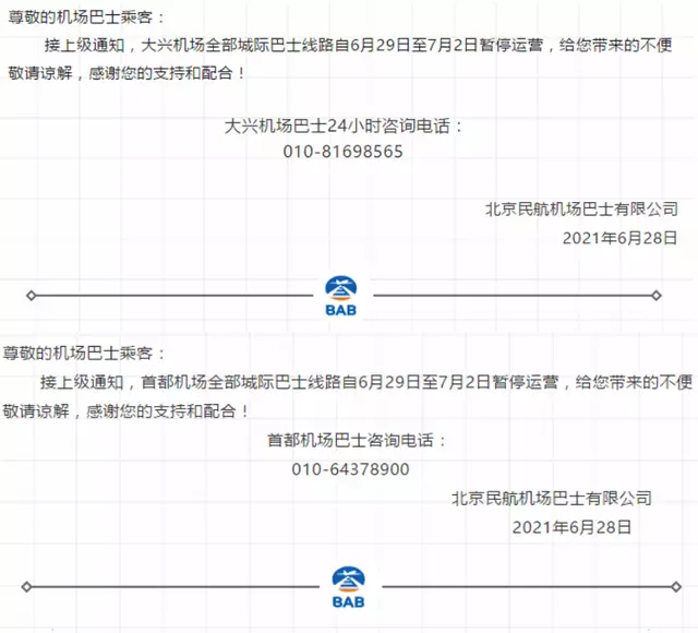 據北京民航機場巴士有限公司微信公眾號,大興機場、首都機場全部城際巴士線路自6月29日至7月2日暫停運營。另外,6月30日至7月2日首都機場燕郊線運營也暫停運營。