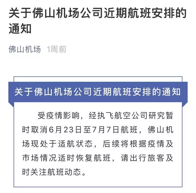 受疫情影響,經執飛航空公司研究,暫時取消6月23日至7月7日航班,佛山機場現處於適航狀態,後續將根據疫情及市場情況適時恢復航班。