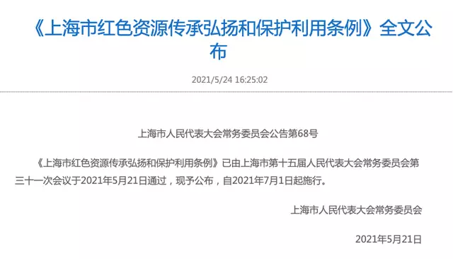 7月起,多地通過立法加強了紅色資源保護傳承,其中,《上海市紅色資源傳承弘揚和保護利用條例》《南京市紅色文化資源保護利用條例》《四川省紅色資源保護傳承條例》於7月1日起正式實施。