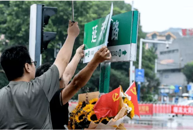 7月1日,正值中國共產黨建黨一百周年,諸多市民自發前往安徽省合肥市延喬路,在延喬路路牌下插國旗,擺放鮮花、卡片。