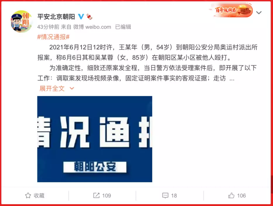 朝陽警方通報稱,6月12日12時許,王某年(男,54歲)到朝陽公安分局奧運村派出所報案,稱6月6日其和吳某蓉(女,85歲)在朝陽區某小區被他人毆打。