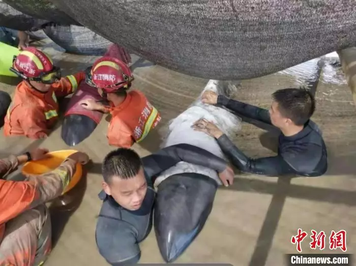 6日8時許,臨海市上盤鎮派出所接到趕小海的村民報警,稱位於頭門港海域北洋壩灘涂上,有10多頭類似鯨豚的「大魚」(後經專家確認為瓜頭鯨)擱淺,需要緊急救援。