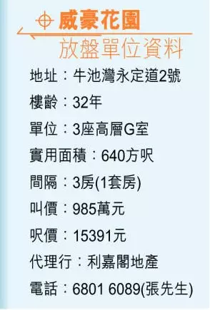 牛池灣威豪花園,交通便利,只需約4分鐘步程便可到達港鐵彩虹站,並鄰近巴士總站,是次介紹該屋苑的高層放盤,實用面積640方呎,3房1套間隔,外望開揚市景,現時以985萬放售,實用呎價約15391元。睇樓王