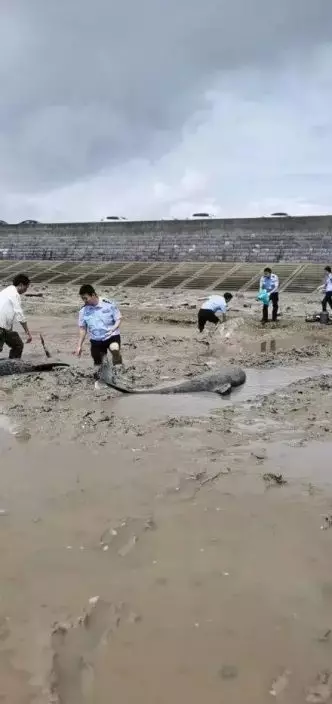 6日上午8時浙江台州臨海市上盤鎮派出所接到村民報警稱位於頭門港海域北洋壩灘涂上12頭類似鯨豚的「大魚」擱淺需要緊急救援隨後,經專家確認擱淺「大魚」為瓜頭鯨