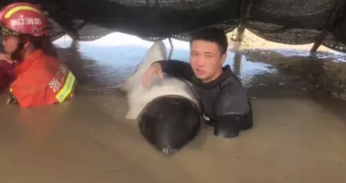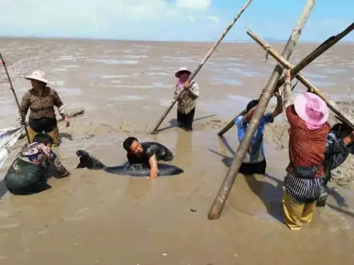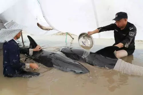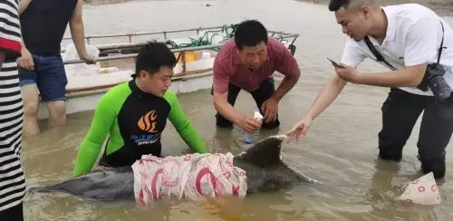 救援人員試圖引導海豚游向外海,但由於水淺和附近環境影響,幾次營救均未見效。經過2個多小時營救,海豚還是沒能游出淺灘,目前救援仍在繼續中。