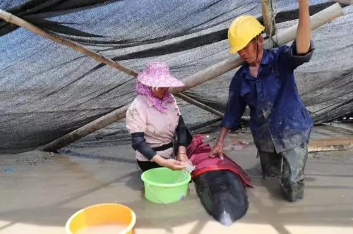 用於暫養鯨魚的養殖塘用冰塊降過溫