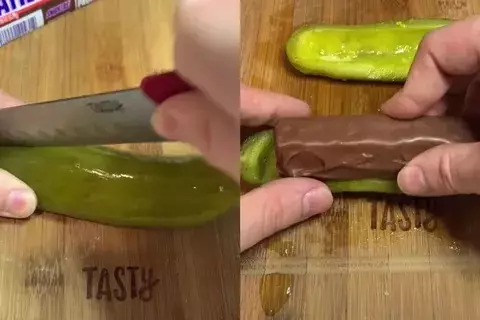 酸黃瓜一般搭配漢堡或熱狗麵包,但最近Tiktok上流行起將酸黃瓜夾著朱古力條食用的風潮,究竟口感和味道如何。一位玩轉各種奇特食物搭配的網紅William Craft日前拍片跟大家分享自己的實測體驗,滿足不敢嘗試的網友們。他表示「其實沒有我想像得那麼糟,好吃程度滿分10分的話可以拿到5分。」