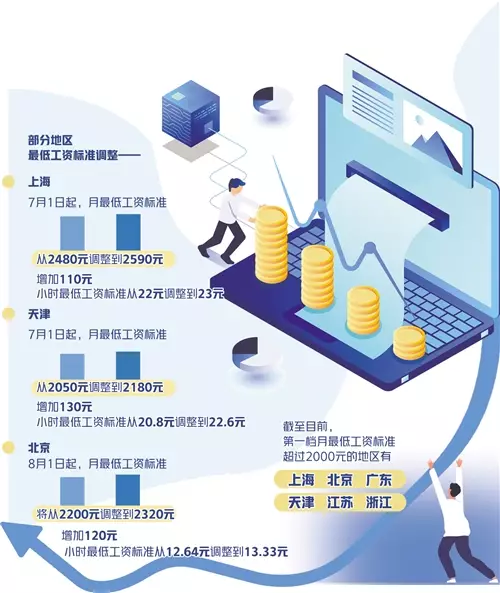 從7月1日起,上海將月最低工資標準從2480元調整到2590元,增加110元,小時最低工資標準從每小時22元調整到23元。